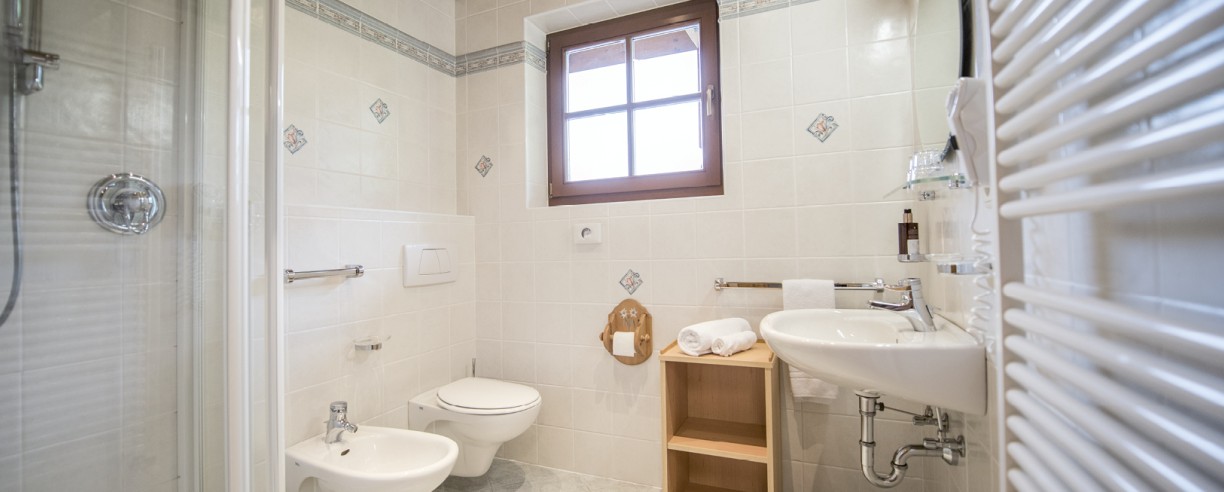 Badezimmer mit Dusche, Bidet, WC, Föhn.