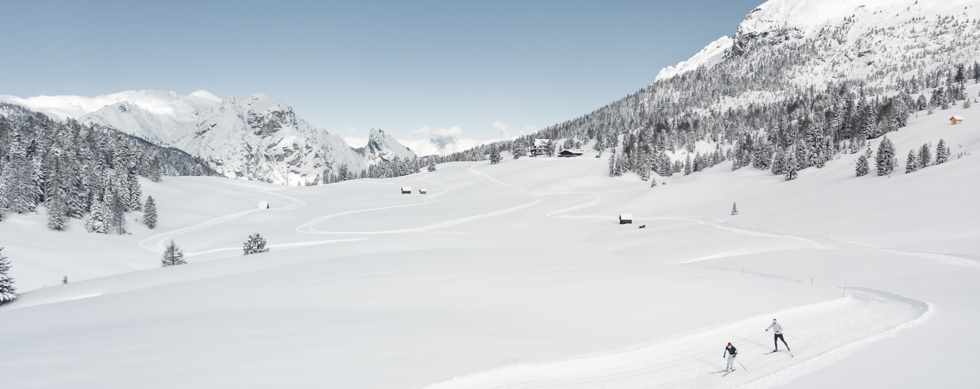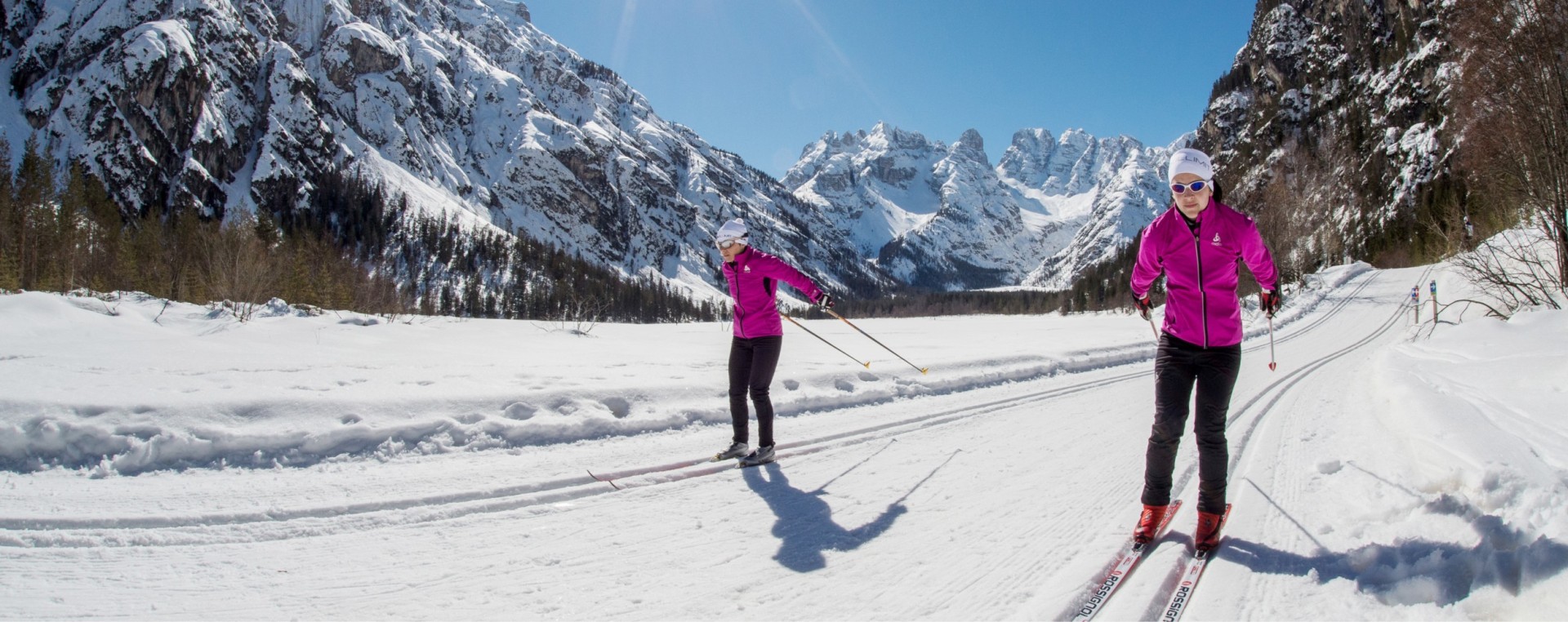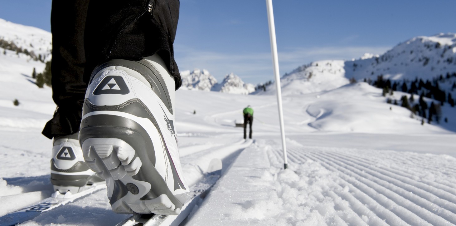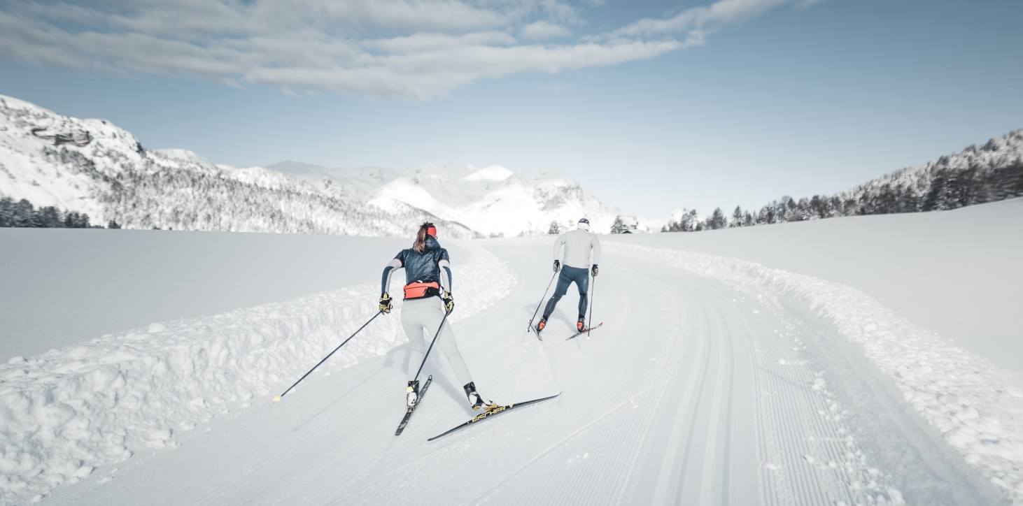 The air is cold, the sky is ice blue, the mountain peaks are white, and the streams are frozen. You can see all this and enjoy winter to the full while cross-country skiing in the Dolomites.